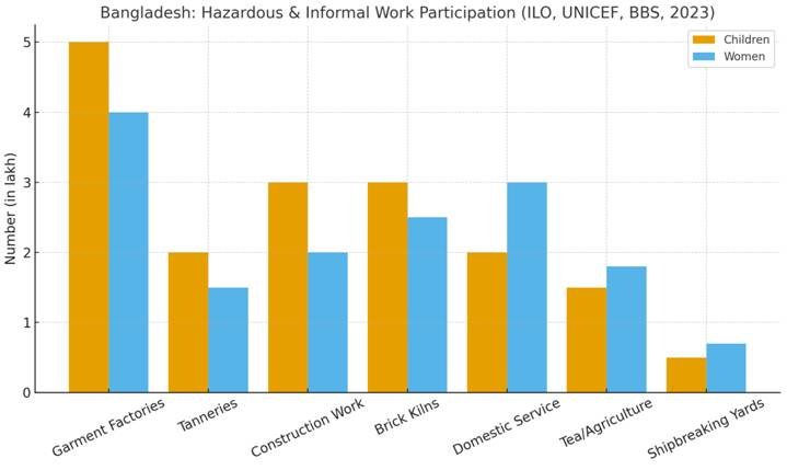 Fowling diagram shows the combined diagram showing both children and women in Bangladesh engaged in hazardous or informal work (based on ILO, UNICEF, and BBS 2023 data).
